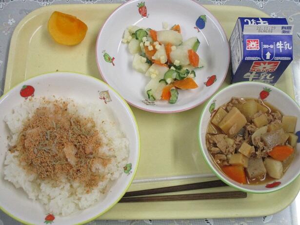 いなり寿司ご飯、アジの海苔塩揚げ、大根のそぼろ煮、りんご、牛乳