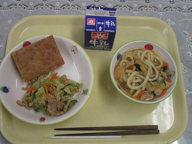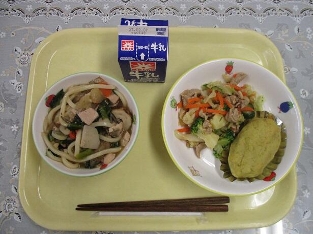 具だくさんうどん、焼肉サラダ、スイートポテト、牛乳