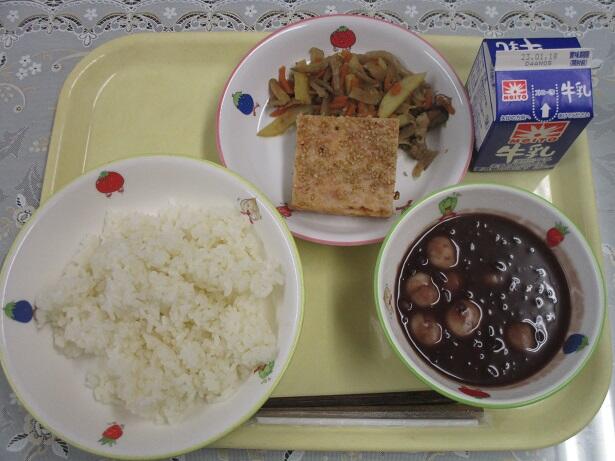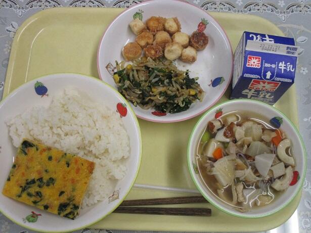 麦ごはん、ツナのさんが焼き、秋のけんちん汁、納豆和え、牛乳