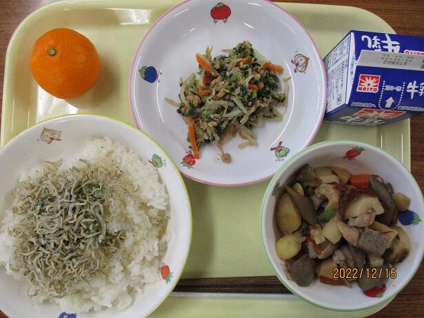 豚肉とごぼうのまぜご飯、ししゃものカレー揚げ、さつま汁、ほうれん草のコーン和え、みかん、牛乳