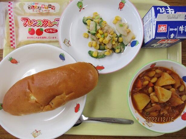 トマトソースに大豆が混ざってまろやかです。スープはベーコンの味が染み出て、優しい味わいです。サラダのドレッシングがまた良い味なのです。給食が終わった後、口の周りをオレンジ色に染めた子にきっと出会うはず。