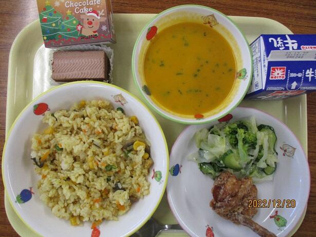 ドリア風カレーピラフ、オニオンスープ、蕪のサラダ、ココアゼリー、牛乳