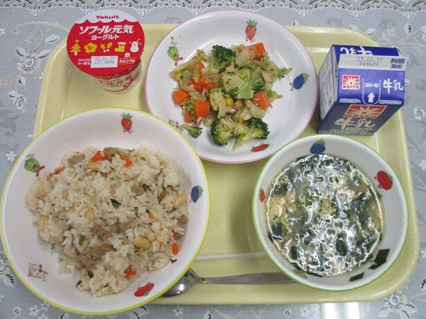 五目釜飯、ちくわの磯辺揚げ、八宝味噌汁、市川の梨、牛乳