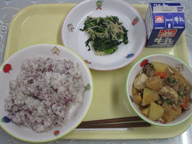 玄米ご飯、チキンカレー、ひじきのマリネ、りんごゼリー、牛乳