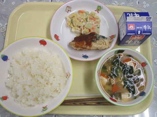 ごはん、サバのねぎ味噌焼き、けんちん汁、塩野菜炒め、牛乳