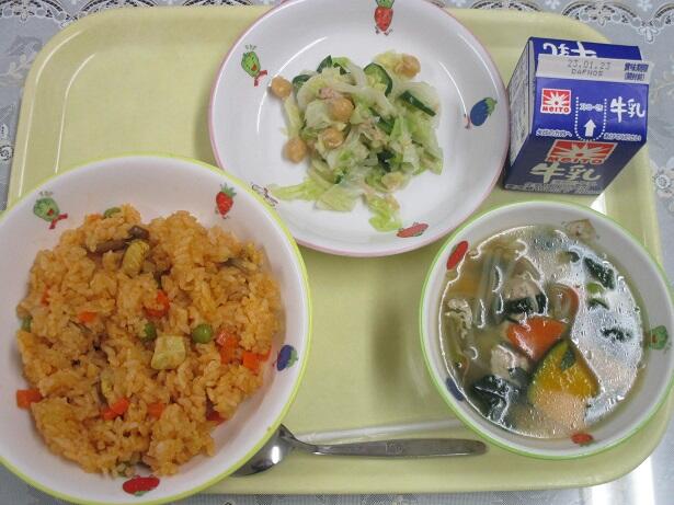 チキンピラフ、白玉スープ、ひよこ豆のサラダ、牛乳