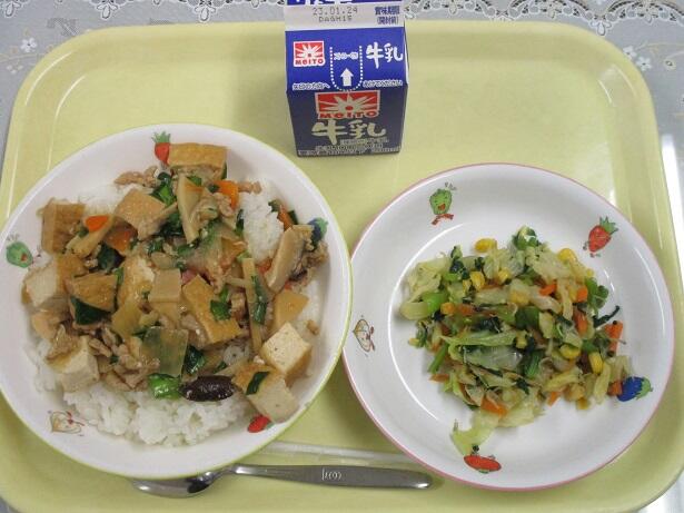ごはん、家常豆腐、ジャコとコーンのナムル、牛乳