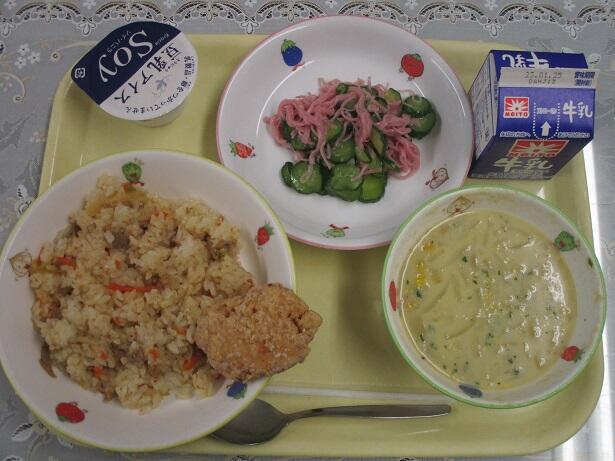 キムチチャーハン、唐揚げ、コーンスープ、キュウリの酢の物、アイス、牛乳