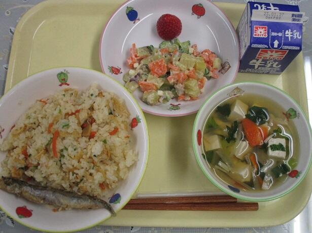 せりごはん、シシャモの唐揚げ、すまし汁、さつまいもサラダ、いちご、牛乳