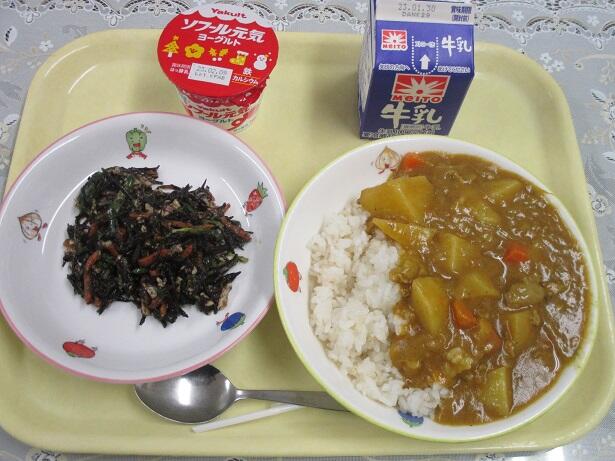 麦ごはん、ポークカレー、ひじきのマリネ、ヨーグルト、牛乳