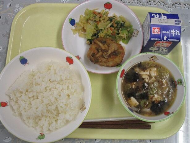 ごはん、鶏肉のみそ煮、納豆和え、牛乳