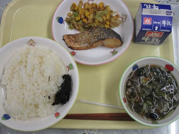 ごはん、ぶりの南部焼き、沢煮椀、コーン和え、海苔の佃煮、牛乳