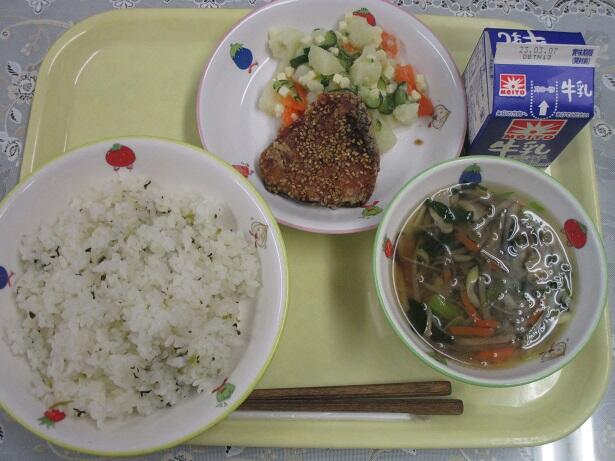 ごはん、サバのごまだれ焼き、かきたま汁、塩野菜炒め、牛乳