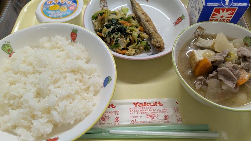 ししゃものカレー揚げ、ししゃもの香ばしさとカレーの味がほどよく効いていて、ご飯がよく進みます。豚汁は、厚揚げがほどよい柔らかさで、大根をはじめ具はよく汁がしみ込んでいて美味しいです。ごま和えは、ごま砂糖が程よい甘さで、たくさんの野菜がとれます。ゆずゼリーは、冷たくてゆずの後味がしっかり残る美味しいデザートでした