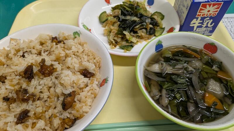 春雨スープは、鶏肉の出汁がよく出ています。春雨はのどごしがよく、ツルツル食べられます。ししゃものからあげは、カリッと揚がって美味しいです。担任の頃、ししゃもが出ると、子ども達に頭から食べると頭がよくなる、しっぽから食べると足が速くなる、お腹から食べると健康になると話をしながら食わず嫌いがなくなるようにしていました。私は頭から食べました!ビビンバは、ご飯にひき肉が混ざっています。上には、卵と野菜を添える盛り付けになっています。給食の配膳がスムーズにいくような工夫がされています。