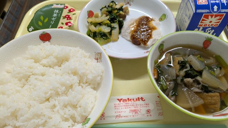 ご飯 鶏肉のごまだれ けんちん汁 ゆず和え 抹茶ゼリー 牛乳