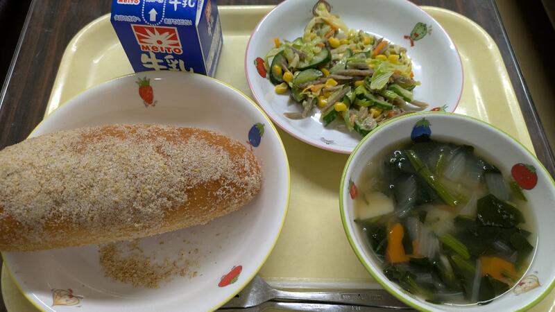 ぶどうパンは、レーズンの甘味がパンとよくマッチしていて、牛乳やミネストローネと一緒に食べると美味しさが引き立ちます。ミネストローネは、すっきりした酸っぱさの中でよく煮込まれたたくさんの野菜を食べられます。ツナと茎ワカメサラダも、ツナといっしょに豊富な野菜がとれて、栄養満点です。