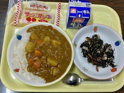 ポークカレーライス、ひじきのマリネ、クレープ(いちご)、牛乳