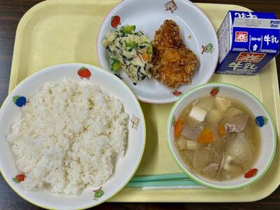 ごはん、鶏肉のから揚げ、豚汁、ひじポテサラダ、牛乳
