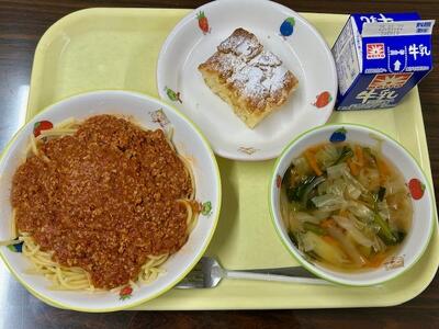 ボロネーゼスパゲッティ、きゃべつスープ、りんごケーキ、牛乳