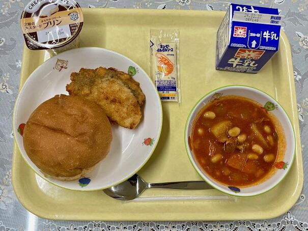 前回カレーパンだった時は、理由は忘れましたが給食時間に不在だったので、学校に戻った時に残しておいてもらった記憶があります。今日の感想、それは(1)パンがおいしい (2)揚げがちょうどよく気持ちよく膨らんでいる (3)カレー餡の部分がしっかり入って甘めのいい味。サラダは旬のブロッコリーとベーコンがよく合います。煮込みは、カブやジャガイモ厚揚げがゴロゴロ入ってボリュームたっぷり。手間と調理員さんたちの愛情たっぷりの給食です。