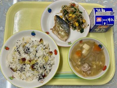 サツマイモご飯、サバの文化干し焼き、豚汁、おかかの辛し和え、牛乳