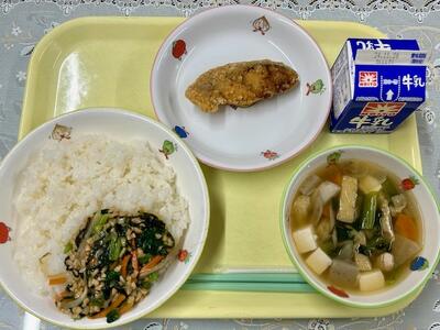 長ネギとショウガの良い味が口いっぱいに広がります。程よいとろみで、白ご飯にピッタリ。ナムルは、小松菜・もやし・人参ですが、ごま油が味を引き締めています。合同学習発表会の舞台練習に出かけているたんぽぽ学級の子供たちも、お腹をすかせて戻ってくるでしょう。