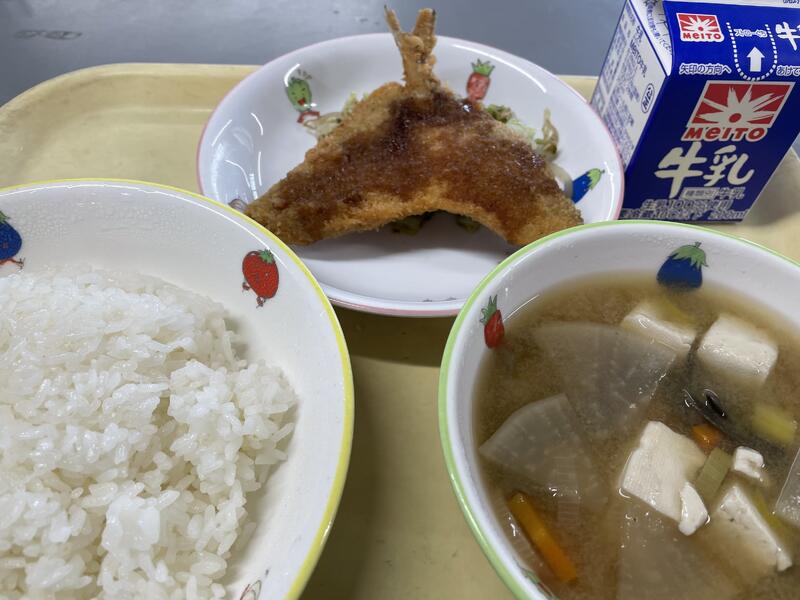 さつま汁は、秋の味覚のさつまいもがたくさん入っています。大根、にんじん、ごぼう、豆腐からもうま味が出ていました。メインの鰺フライは、衣がサクッと香ばしく揚がっていて、中はふっくら。白いご飯がどんどん進みます。磯和えは、子どもに密かに人気なメニューです。