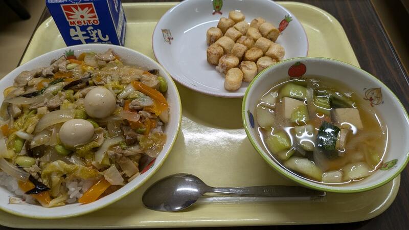 中華丼 チンゲン菜のスープ お麩シュガー 牛乳