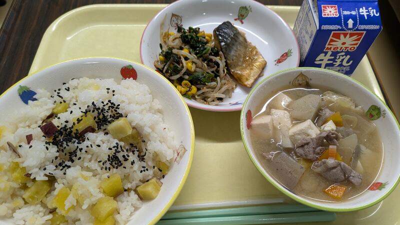 さつまいもご飯 鯖の文化干し焼き 豚汁 おかか辛子和え 牛乳