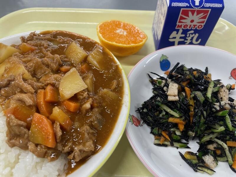 <献立> ハヤシライス ひじきのマリネ みかん 牛乳