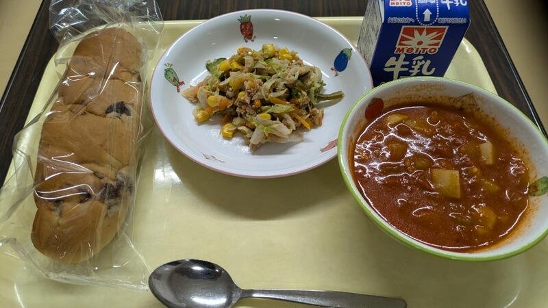 ぶどうパンは、レーズンの甘味がパンとよくマッチしていて、牛乳やミネストローネと一緒に食べると美味しさが引き立ちます。ミネストローネは、すっきりした酸っぱさの中でよく煮込まれたたくさんの野菜を食べられます。ツナと茎ワカメサラダも、ツナといっしょに豊富な野菜がとれて、栄養満点です。