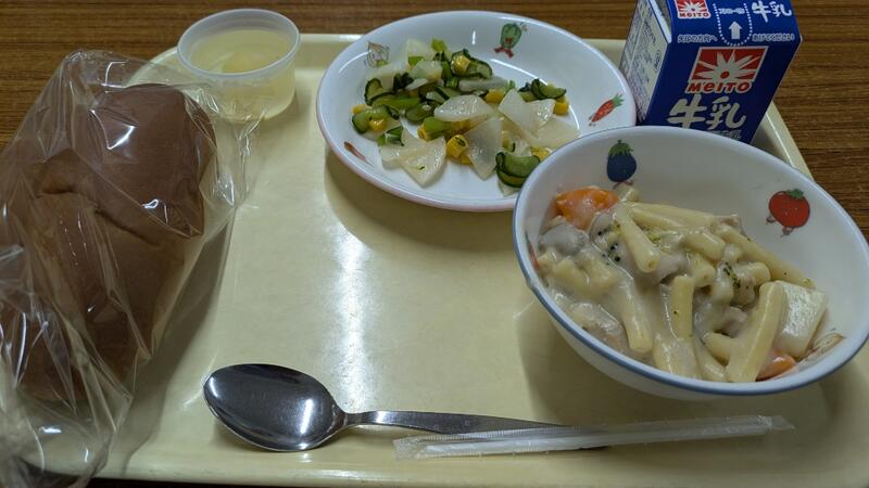 黒糖パンは、黒糖の甘さが牛乳を飲むと引き立ちます。マカロニクリーム煮は、人参、ブロッコリー、じゃがいも、鶏肉がたくさん入っていてボリューミーです。かぶのサラダは、かぶがシャキシャキしていて新鮮な野菜の味が感じられます。パインゼリーは、ゼリーがプルプルしていてパインの果実が甘くて美味しいです。