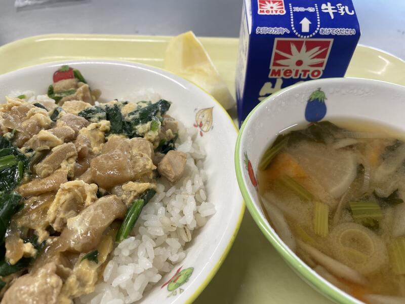 <献立> おふたま丼 味噌汁 りんご 牛乳
