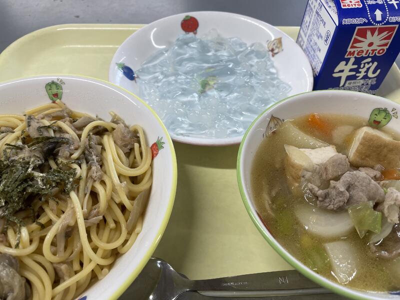 <献立> きのこスパゲティー 洋風煮込み チリとチリリのゼリー(サイダーゼリー) 牛乳