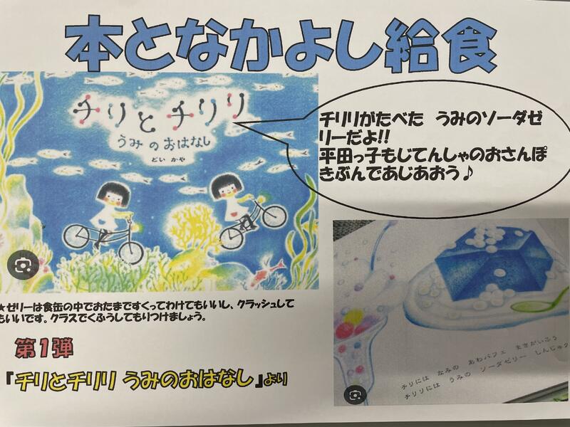 きのこスパゲティーは、たくさんのきのこが入っており、いい味の出汁が出ています。洋風煮込みは、大きめにカットされた豚肉、じゃがいも、にんじんなど入っているため食べ応えがあります。今日は読書週間イベントの「お話給食」の日です。「チリとチリリ うみのはなし」に出てくる【うみのソーダーゼリー】がデザートでした。タピオカは真珠を表現しています。ナイスアイディア!