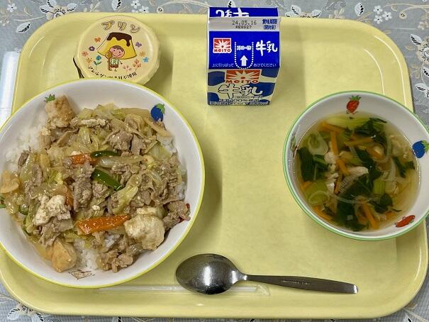 チンジャオロース丼、わかめスープ、小夏、牛乳