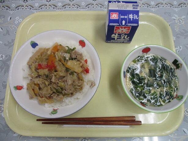 チンジャオロース丼、わかめスープ、小夏、牛乳