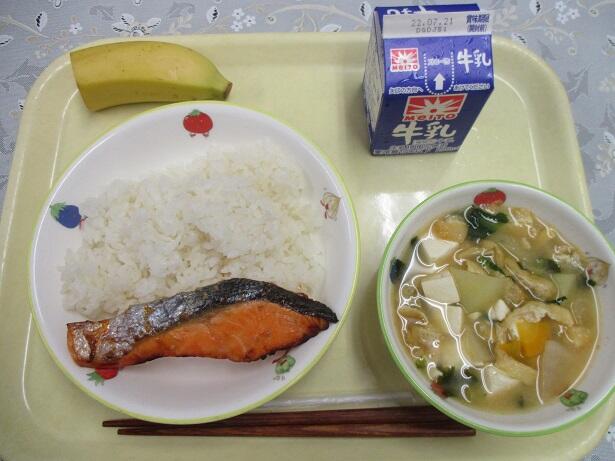 ごはん、鮭のピリ辛焼き、具だくさん味噌汁、バナナ、牛乳