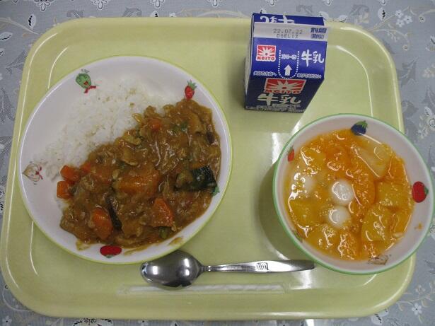 ごはん、夏野菜カレー、フルーツ白玉、牛乳