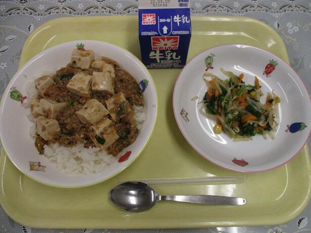 ひと月半ぶりの給食です。麻婆豆腐丼はしつこくなく、しっとりした味わいです。ナムルはごま油が香り、塩分を抑えた味付けが野菜のおいしさを感じさせます。