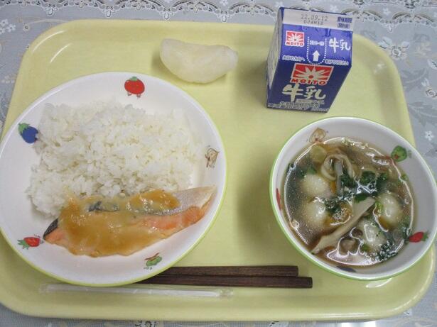 ごはん、鮭のマヨネーズ味噌焼き、だまこ汁、市川の梨、牛乳
