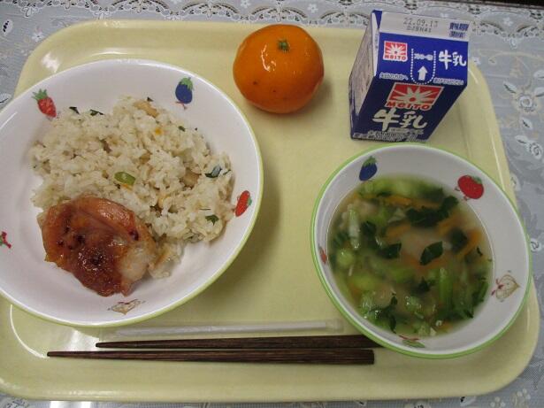 菜飯、鰺のマリネ、冬瓜汁、冷凍リンゴ、牛乳