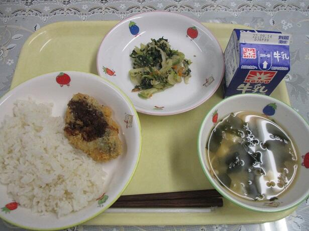 ごはん、アジフライ、胡麻和え、味噌汁、牛乳