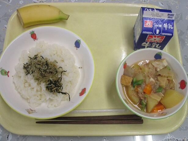 ごはん、ジャガイモと生揚げのそぼろ煮、小松菜のふりかけ、バナナ、牛乳