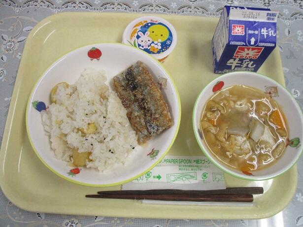 栗ごはん、サンマの蒲焼き、豚汁、十五夜ゼリー、牛乳