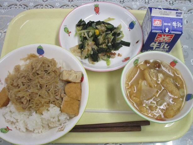 ごはん、豚丼の具、和風サラダ、なめこ汁、牛乳