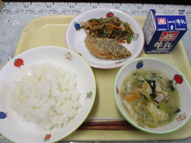 ごはん、具だくさんスープ、ホッケのカレー揚げ、茎わかめのきんぴら、牛乳