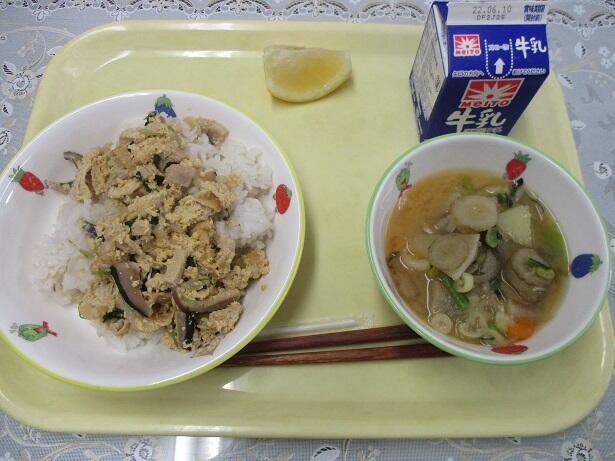 麦ごはん、あぶ玉丼の具、味噌汁、小夏、牛乳