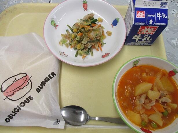 食べ慣れた給食なのにタコライスは初めて!上にのった茹野菜がさわやかさを演出します。スープはベーコンの良い味と野菜の甘さが何とも言えずGoodです。そして、メ~ロ~ン~